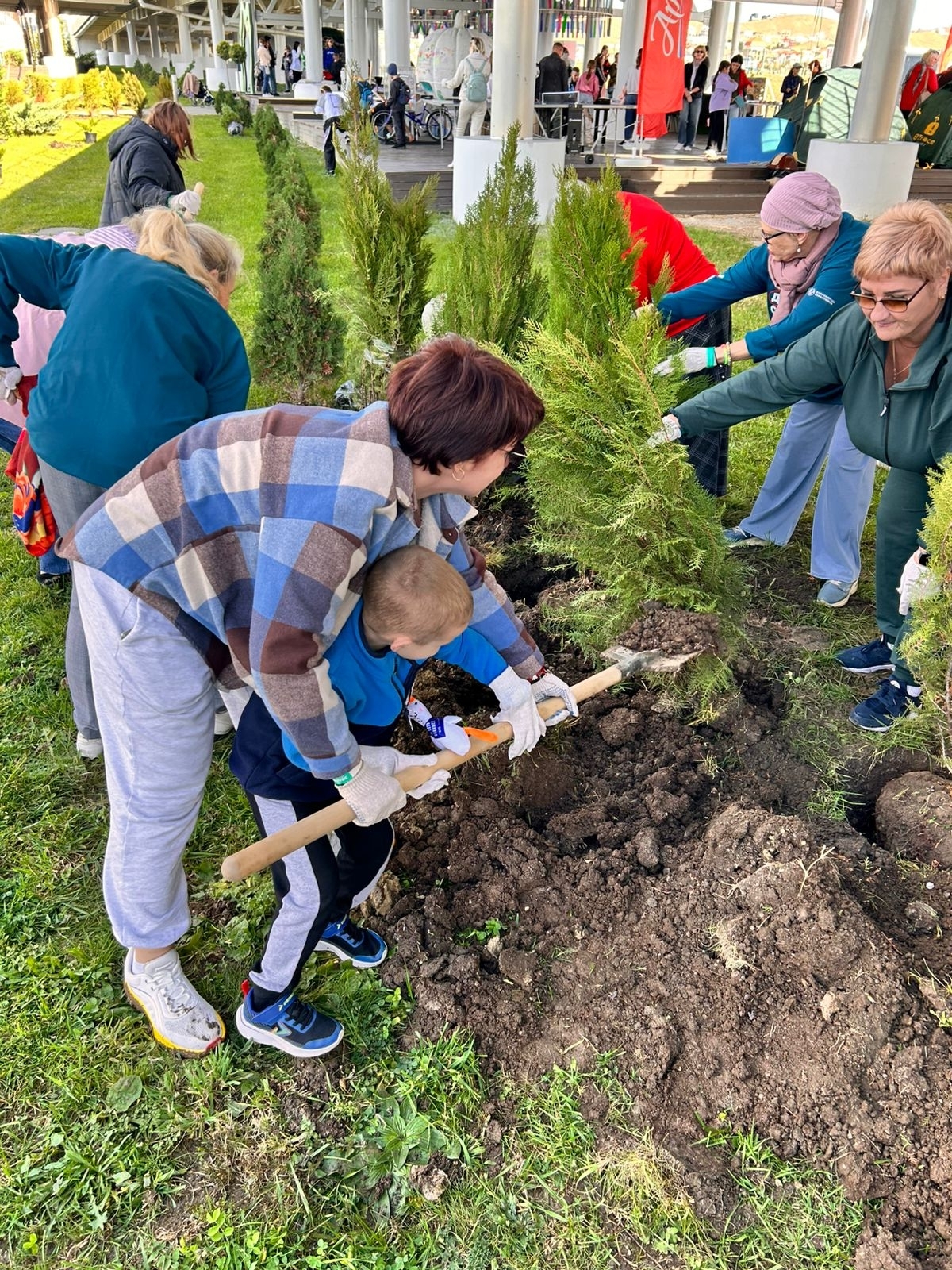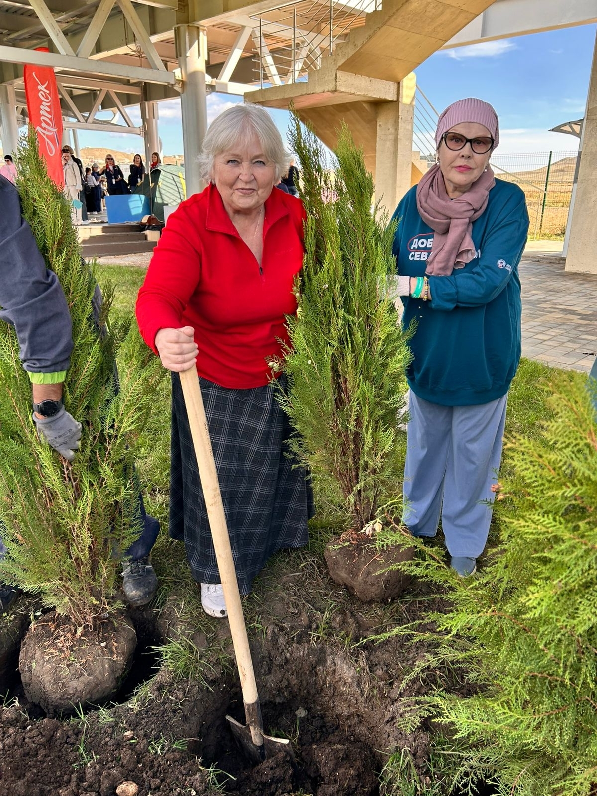 Нам предстояло высадить более 30 молодых туй. Организаторы подготовили площадку: ямы были выкопаны, а саженцы ждали своего часа. Казалось бы, задача проста — поместить дерево в лунку и засыпать землёй. Однако ночью перед фестивалем прошёл сильный дождь, и земля превратилась в тяжёлую, влажную глину. Но это никого не остановило! С энтузиазмом и командным духом наши участники справились с задачей. В результате на территории «Таврида Арт» теперь красуется целая аллея, которая будет расти и зеленеть вместе с нашими добрыми воспоминаниями об этом дне.